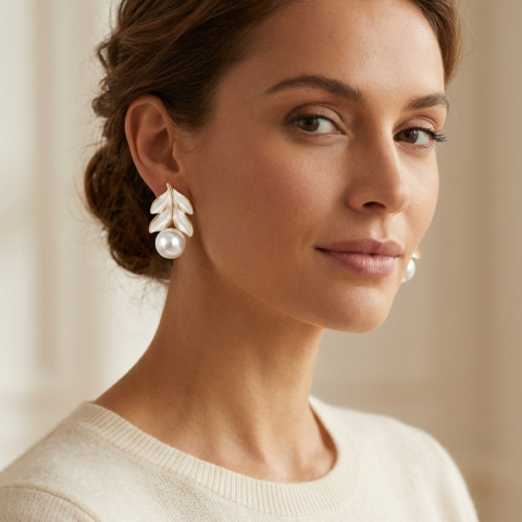 Elegant Pearl Leaf Stud Earrings – Gold-Toned Enamel Leaf Statement Earrings – Vintage-Inspired Botanical Jewelry for Women
