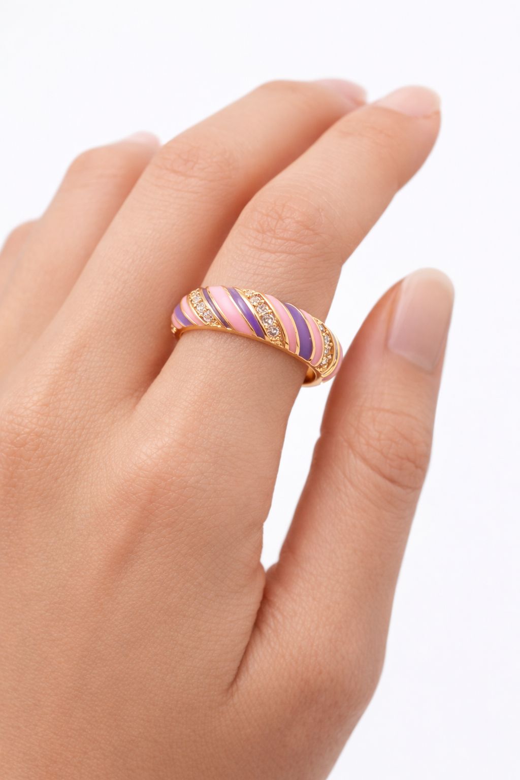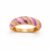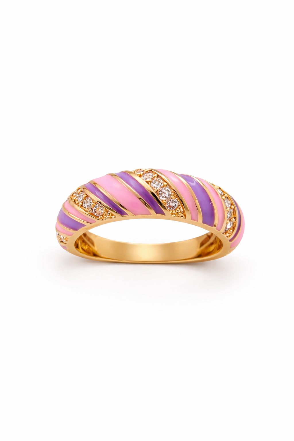 A vibrant, gold-plated dome ring featuring alternating stripes of pastel pink and royal purple enamel, accented with sparkling rows of precision-set crystals.