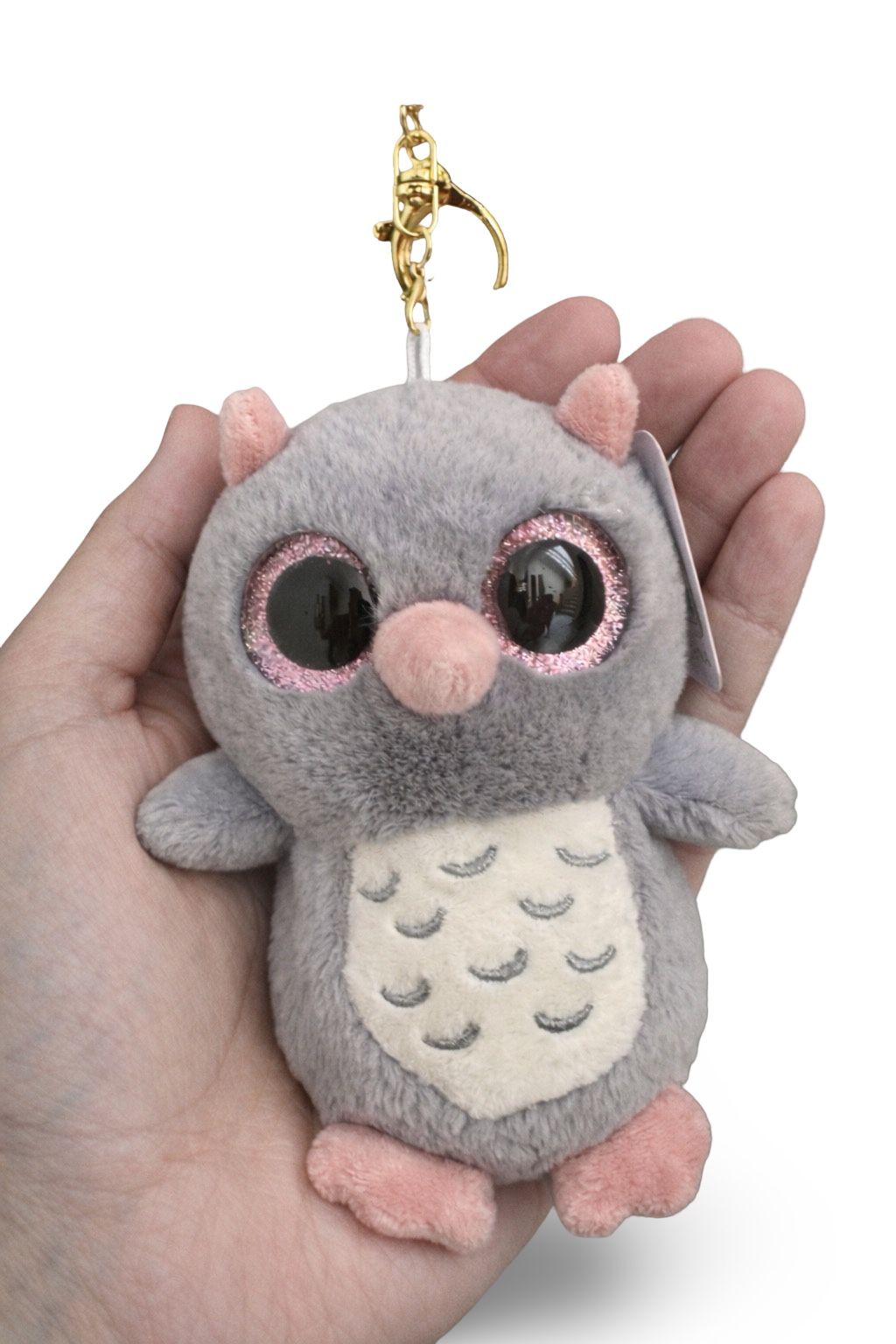 Carry a little wisdom and a lot of “aww” wherever you go! This ultra-soft, grey plush owl keychain features captivating pink glitter eyes and a sturdy gold-tone clasp. It’s the perfect whimsical accessory to personalize your backpack, purse, or keys.