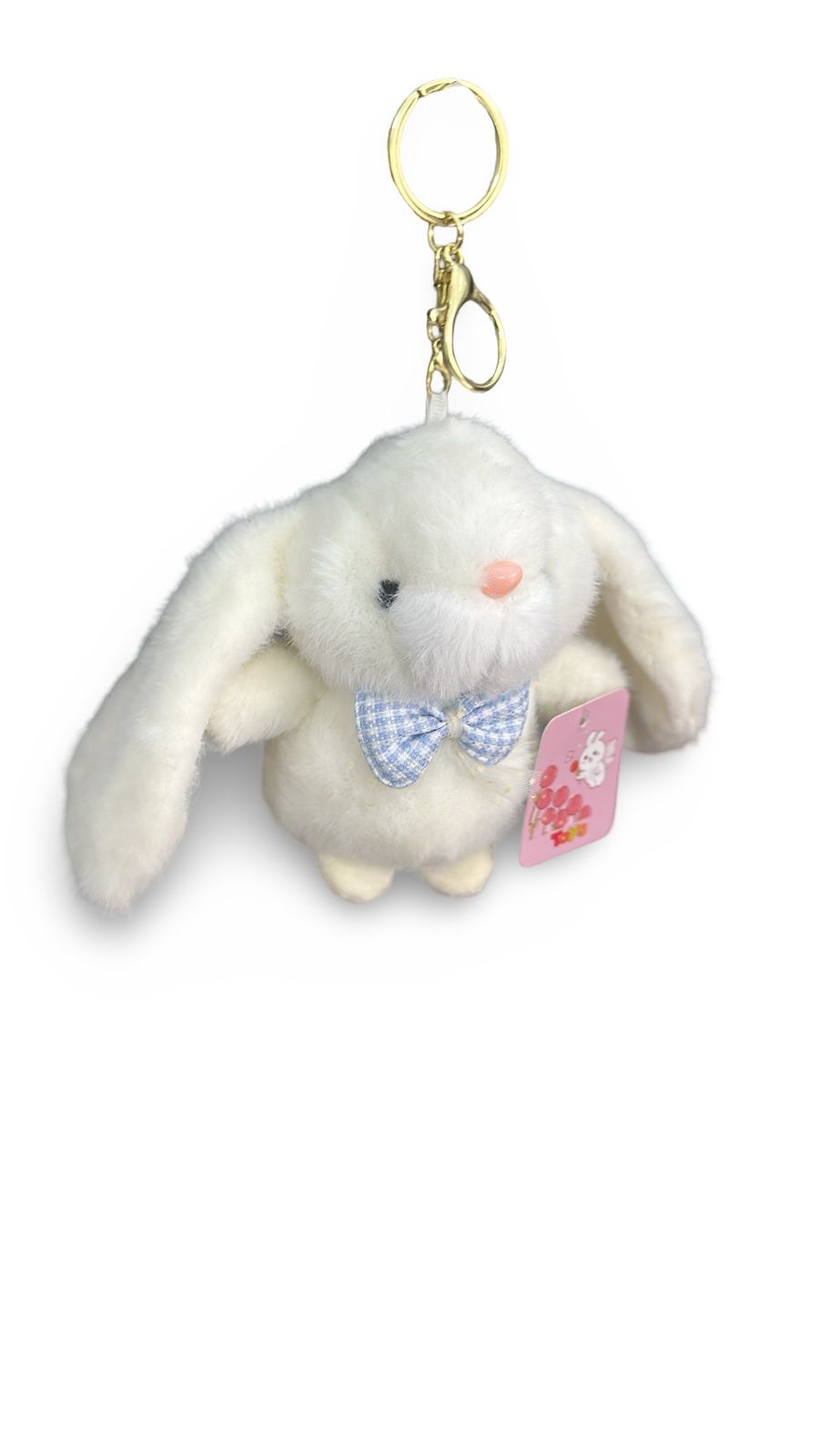 Hop into style with this darling white bunny plush keychain. Featuring oversized floppy ears, a sweet pink nose, and a charming blue plaid bowtie, this rabbit charm adds a whimsical touch to any accessory.