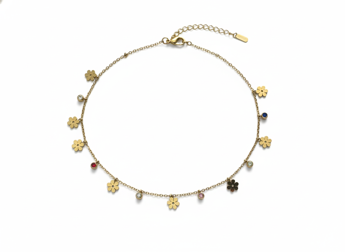 Bring a touch of springtime to your everyday style with our Gold Flower & Multicolor Crystal Choker. Featuring delicate gold-plated floral charms interspersed with vibrant, bezel-set colorful crystals, this whimsical necklace is the perfect dainty statement piece for layering or wearing solo.