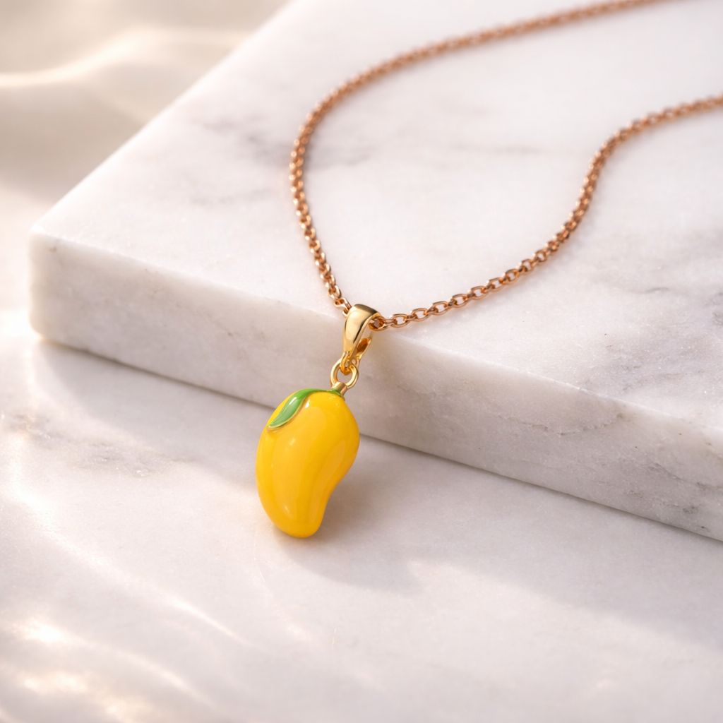 Add a sweet, tropical twist to your jewelry collection with our Dainty Gold Mango Pendant Necklace. This playful piece features a vibrant yellow enamel mango charm, complete with a tiny green leaf detail, suspended from a high-quality gold-toned cable chain.
