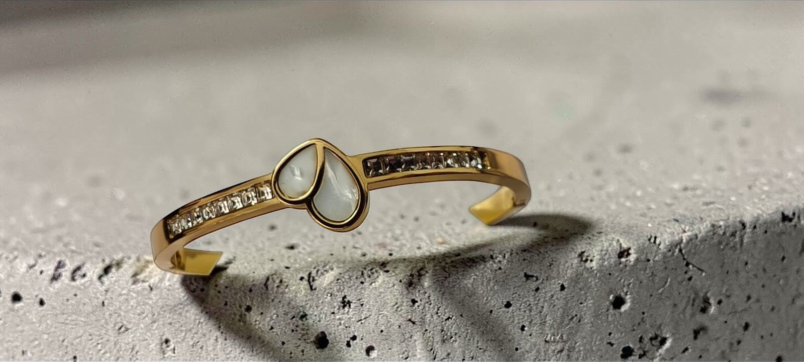 Discover the perfect balance of subtlety and sophistication with our Pearlescent Petal Gold Cuff Bangle. This piece is designed for the woman who appreciates fine details and clean silhouettes. The centerpiece features two interlocking “petals” or “teardrops” that create a soft heart-like shape, symbolizing harmony and beauty.