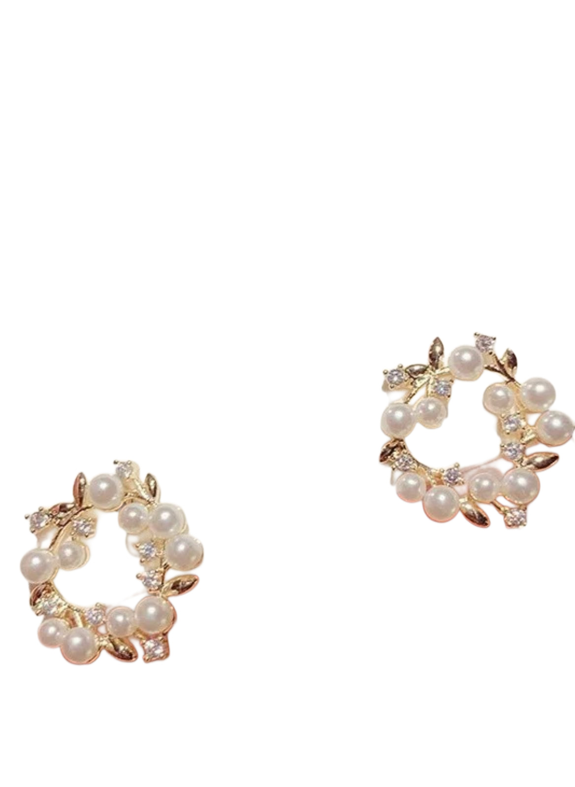 Intricate Botanical Design: These stunning studs feature a finely crafted wreath motif, where gold-toned vines meet shimmering pearls and micro-zirconia stones for a radiant, multi-dimensional look.