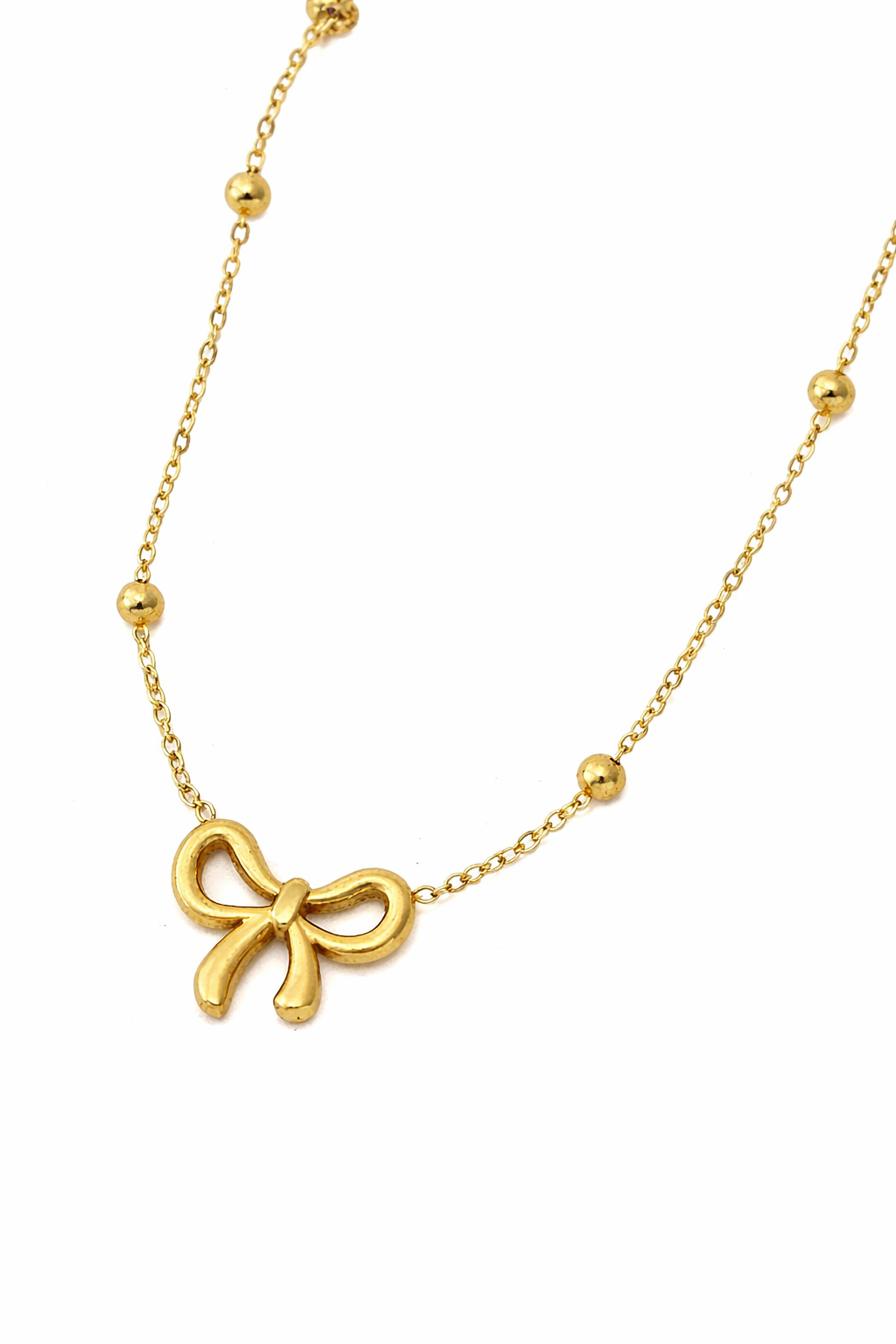 Gold Bow Pendant Necklace – Minimalist Dainty Ribbon Charm Jewelry for Women – 18K Gold Plated Beaded Chain Necklace
