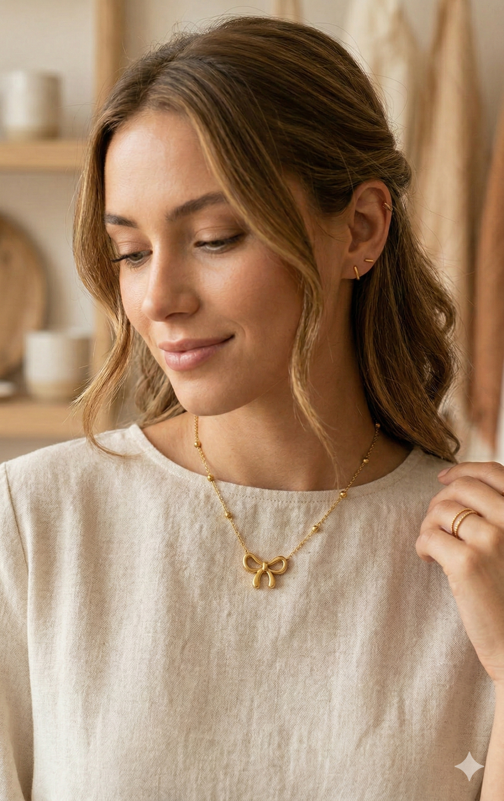 Whether you’re dressing up for a brunch date or adding a subtle glow to your everyday office wear, this minimalist bow necklace is the ultimate versatile accessory.