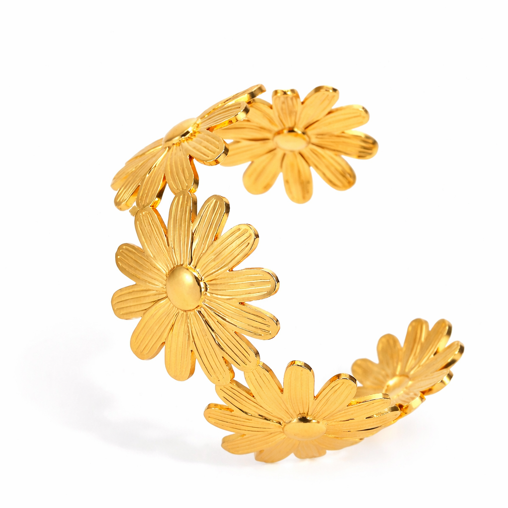 Embrace timeless botanical beauty with this Gold-Tone Daisy Floral Cuff Bangle. Featuring a stunning open-wrap design with detailed stainless steel sunflower motifs, this adjustable statement bracelet adds a radiant, nature-inspired glow to any outfit.
