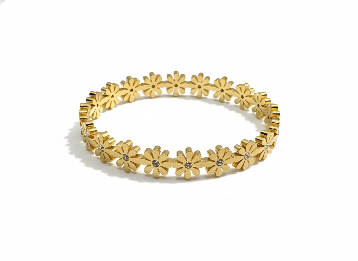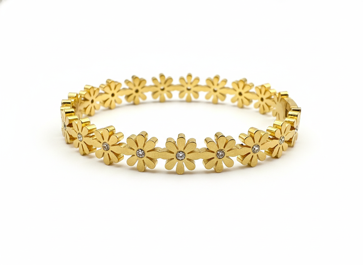 Embrace the beauty of nature with the Nayraah Daisy Floral Bangle. Featuring a continuous row of meticulously crafted 18K gold-plated daisies, each accented with a brilliant-cut cubic zirconia center, this bangle offers a fresh, feminine touch to any outfit. Tarnish-resistant and designed for all-day comfort.