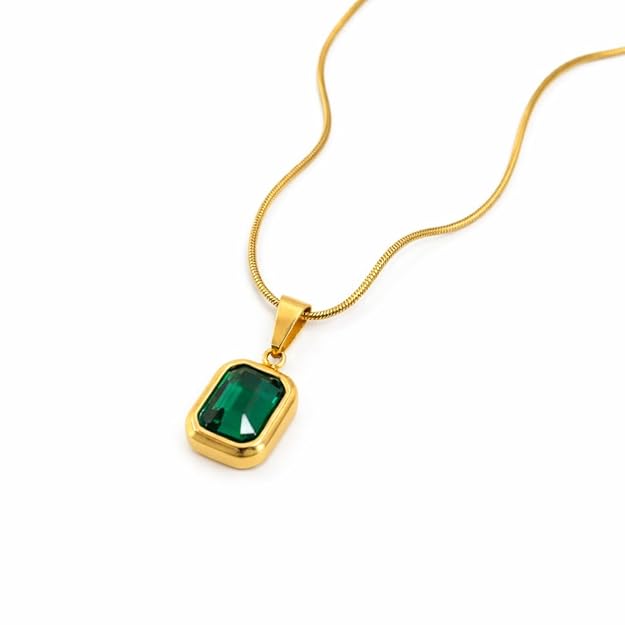 Radiate timeless sophistication with the Nayraah Emerald Solitaire Necklace. Featuring a stunning, deep green emerald-cut crystal held in a sleek gold-plated bezel setting, this pendant is suspended from a classic link chain. It’s the perfect blend of vintage royalty and modern minimalism for any jewelry collection.