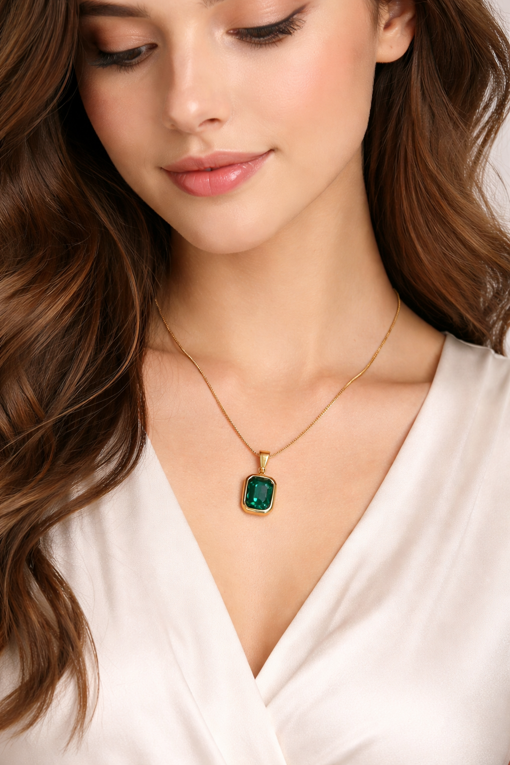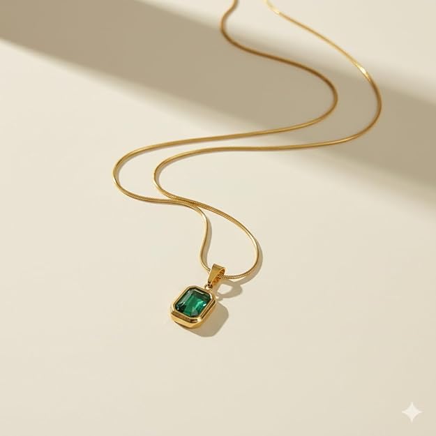 Let this be your “pop of color.” This necklace stands out beautifully against neutral tones like cream, black, or navy. For a high-fashion look, layer it with shorter gold chains or pair it with simple gold hoops to keep the focus on the emerald centerpiece.