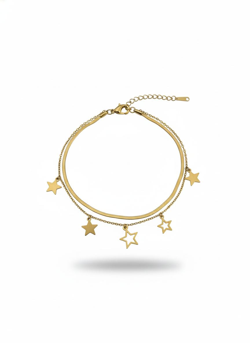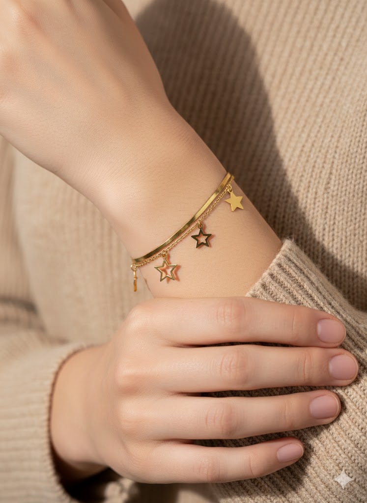 Reach for the stars with the Nayraah Star Charm Layered Bracelet, a masterpiece of contemporary jewelry design. This bracelet perfectly captures the “layered look” in one easy-to-wear piece, combining two distinct textures to create a sophisticated, multidimensional style.