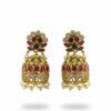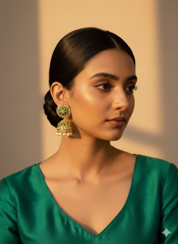 Style Tip: Complement the rich green tones of these Jhumkas by pairing them with a cream or gold Banarasi saree. For a fusion look, wear them with an emerald green velvet lehenga or a white chikankari suit.