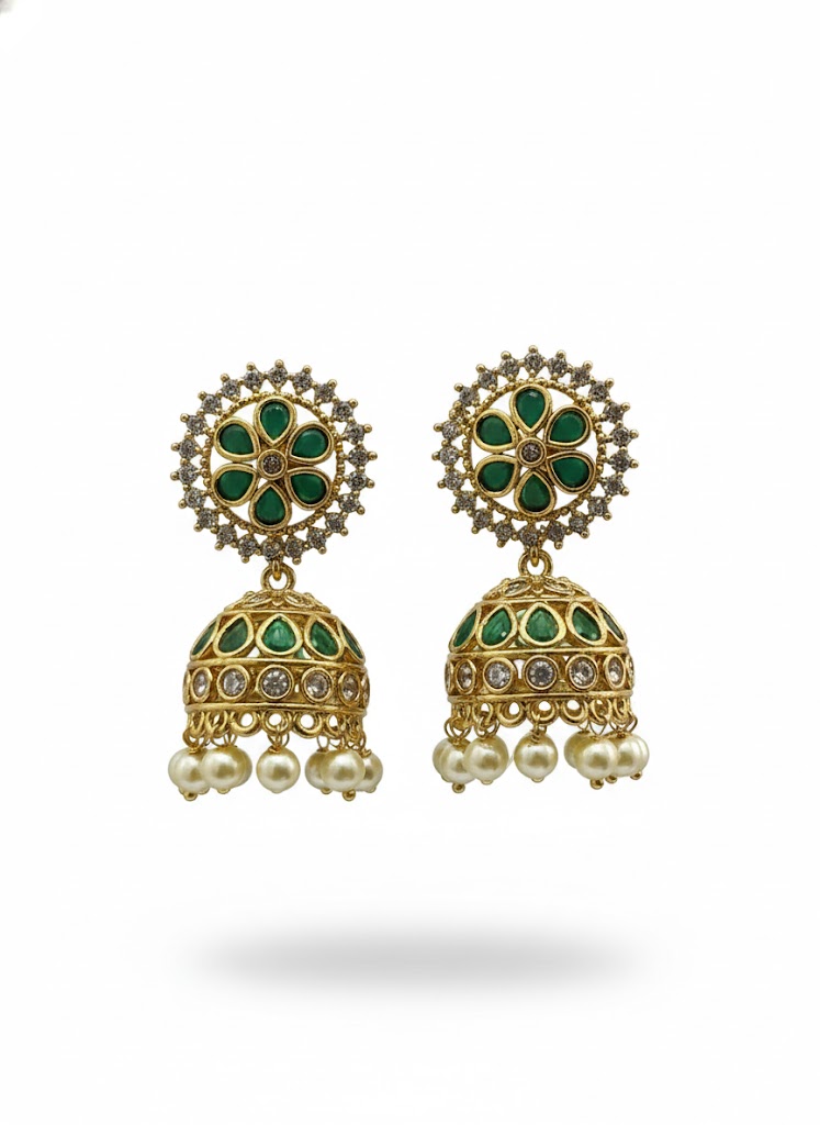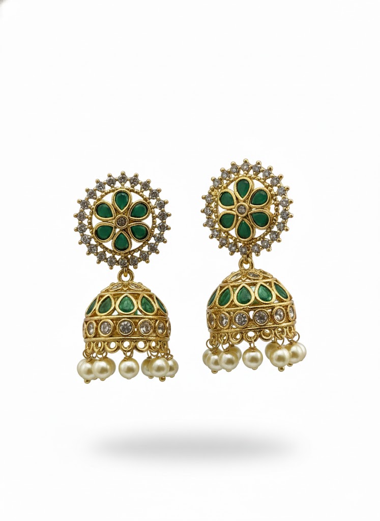 Designed for those who appreciate intricate artistry, these Jhumka earrings feature a stunning floral-shaped stud encrusted with teardrop emerald-green stones and a central zircon. The classic bell-shaped drop is meticulously crafted with rows of shimmering green stones and brilliant white crystals, finished with a cluster of lustrous white pearls for a graceful, sophisticated look.
