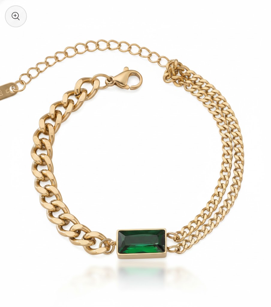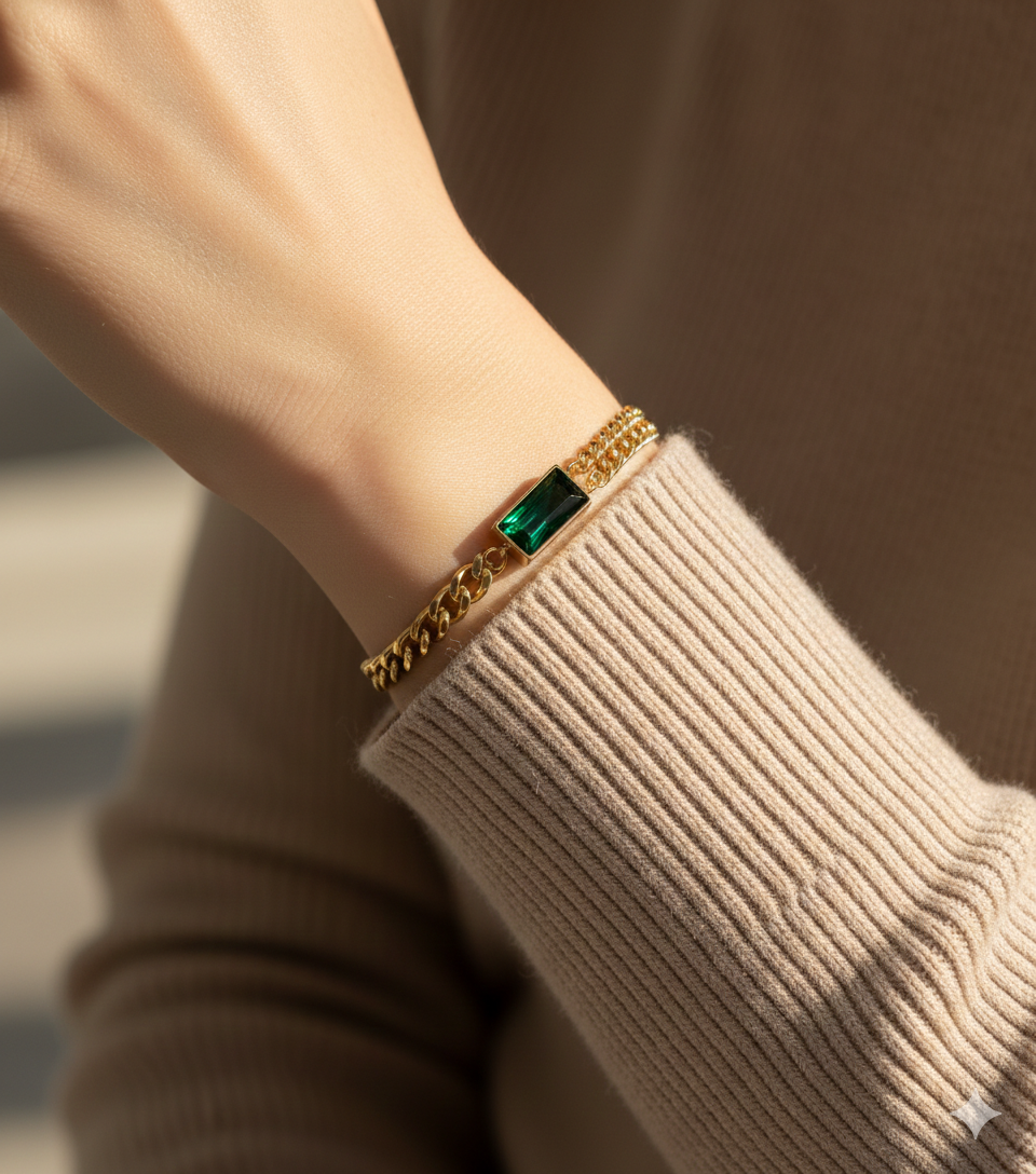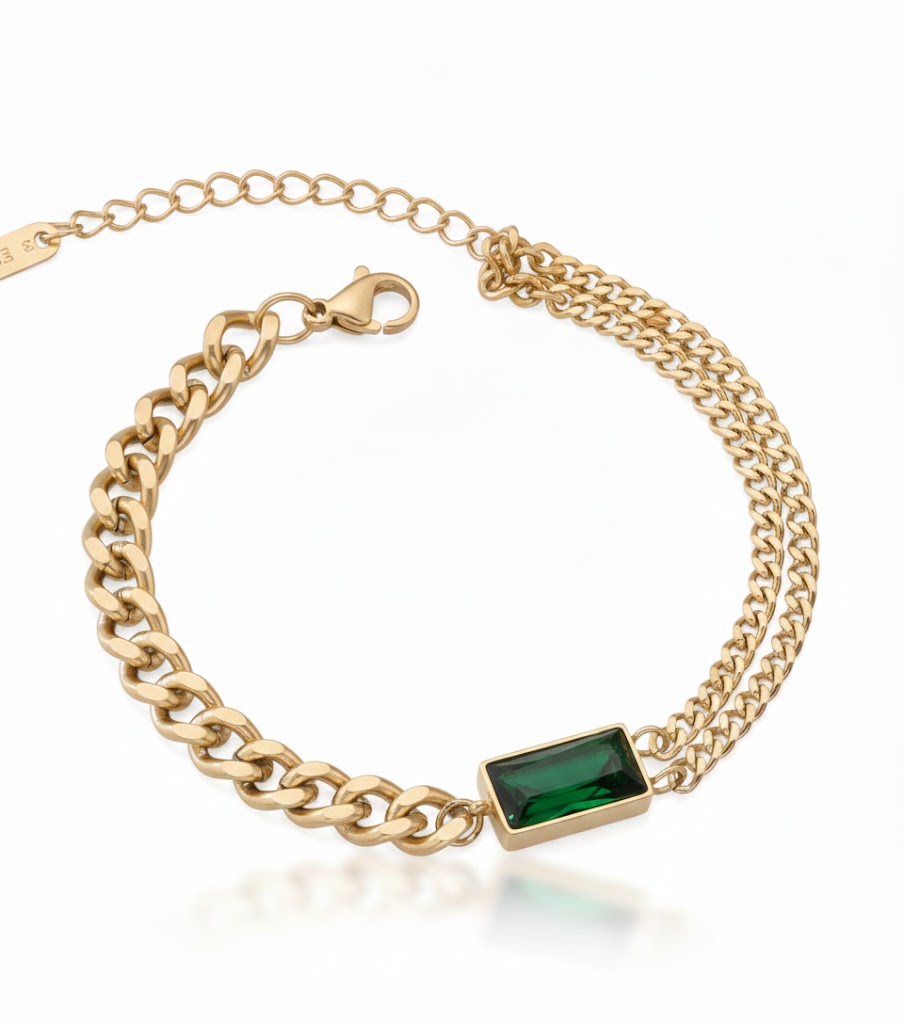 The Nayraah Emerald Crystal Bracelet is designed for the woman who loves to stand out. By merging two distinct jewelry styles—the industrial strength of a curb chain and the feminine grace of a dainty layered strand—this bracelet creates a high-fashion look that is both powerful and elegant.