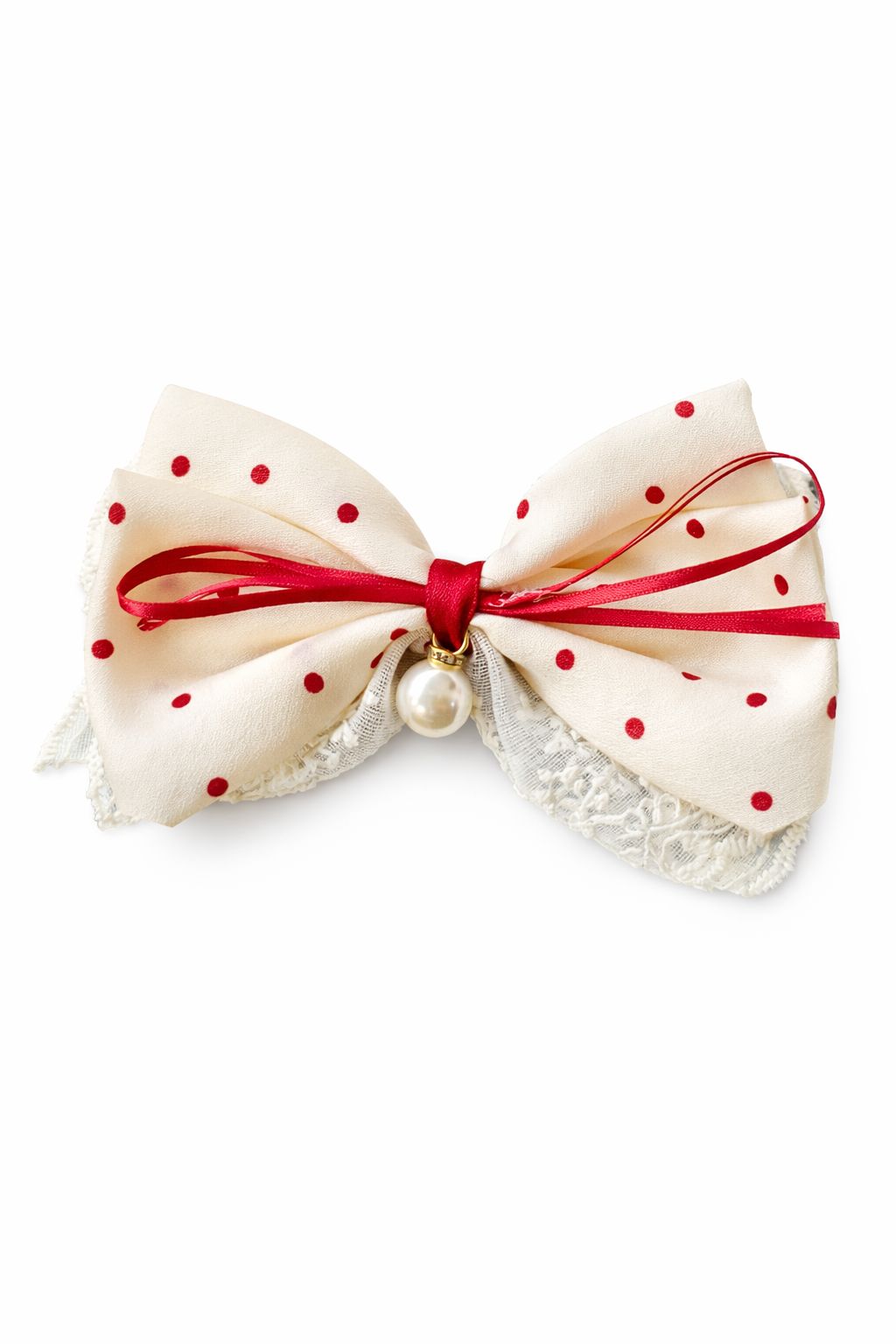 Exquisite Craftsmanship & Detail Every element of this hair clip is designed for the modern romantic. The cream-colored base is perfectly contrasted by vibrant red polka dots and a thin satin ribbon overlay. At the heart of the bow sits a high-luster faux-pearl charm, adding a subtle touch of “quiet luxury” that catches the light beautifully.